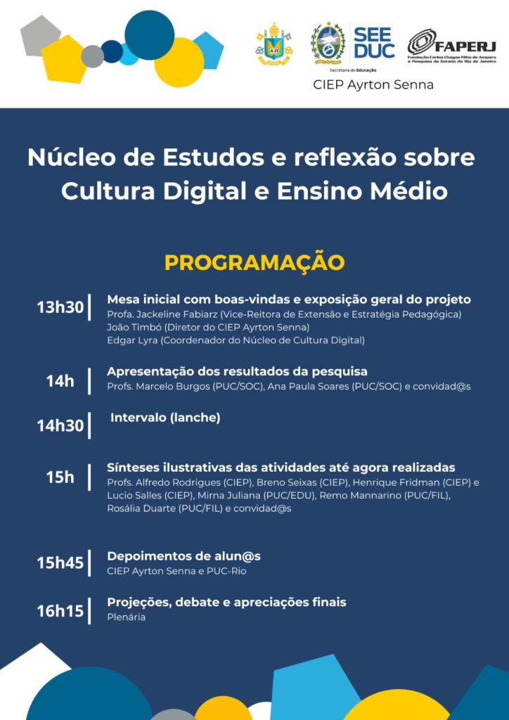 Foi realizado em 6/11/2023, no Auditório Anchieta, da PUC-Rio, o seminário de reflexão sobre as atividades do projeto. Estiveram presentes professores da PUC-Rio, gestores, professores e estudantes do CIEP Ayrton Senna, além de colaboradores eventuais e colegas interessados.